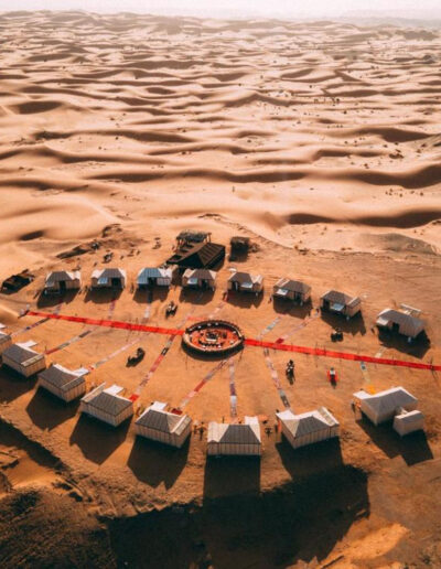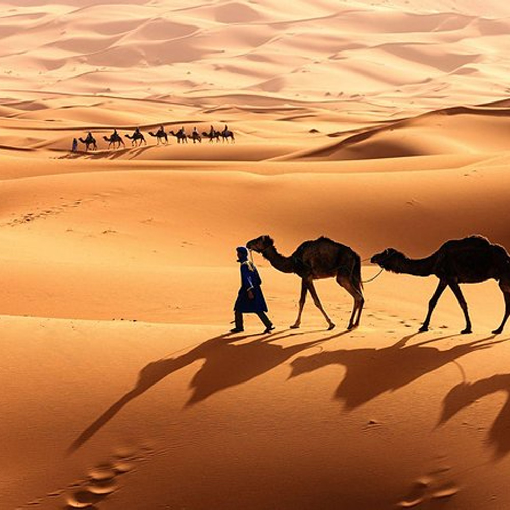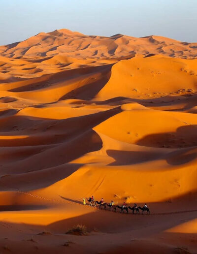 Continúa por paisajes desérticos hasta Erfoud, célebre por sus fósiles y dátiles. Llegada a Merzouga por la tarde y paseo en camello por las dunas de Erg Chebbi para contemplar la puesta de sol.