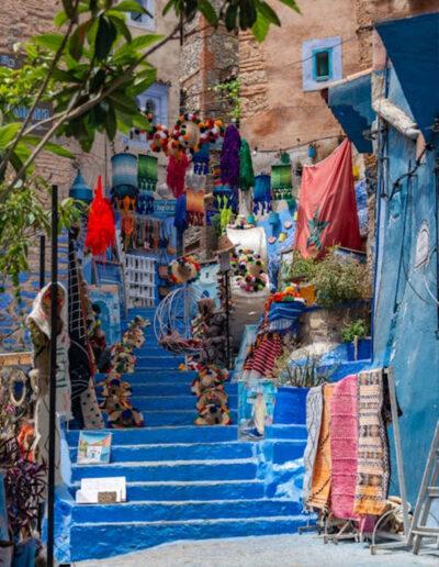 Chefchaouen, fundada en el siglo XV como un bastión montañoso, es famosa por sus encantadoras casas pintadas de azul, callejones estrechos y vibrantes artesanías locales. Al llegar alrededor del mediodía, dispondrás de varias horas para explorar la ciudad a tu propio ritmo. Recorre la antigua medina, donde cada callejón revela puertas coloridas, arquitectura detallada y tiendas de artesanos que ofrecen textiles, cerámica y recuerdos hechos a mano. La plaza principal es animada pero tranquila, bordeada de cafés y edificios históricos, ofreciendo un lugar perfecto para absorber la atmósfera única de la ciudad.