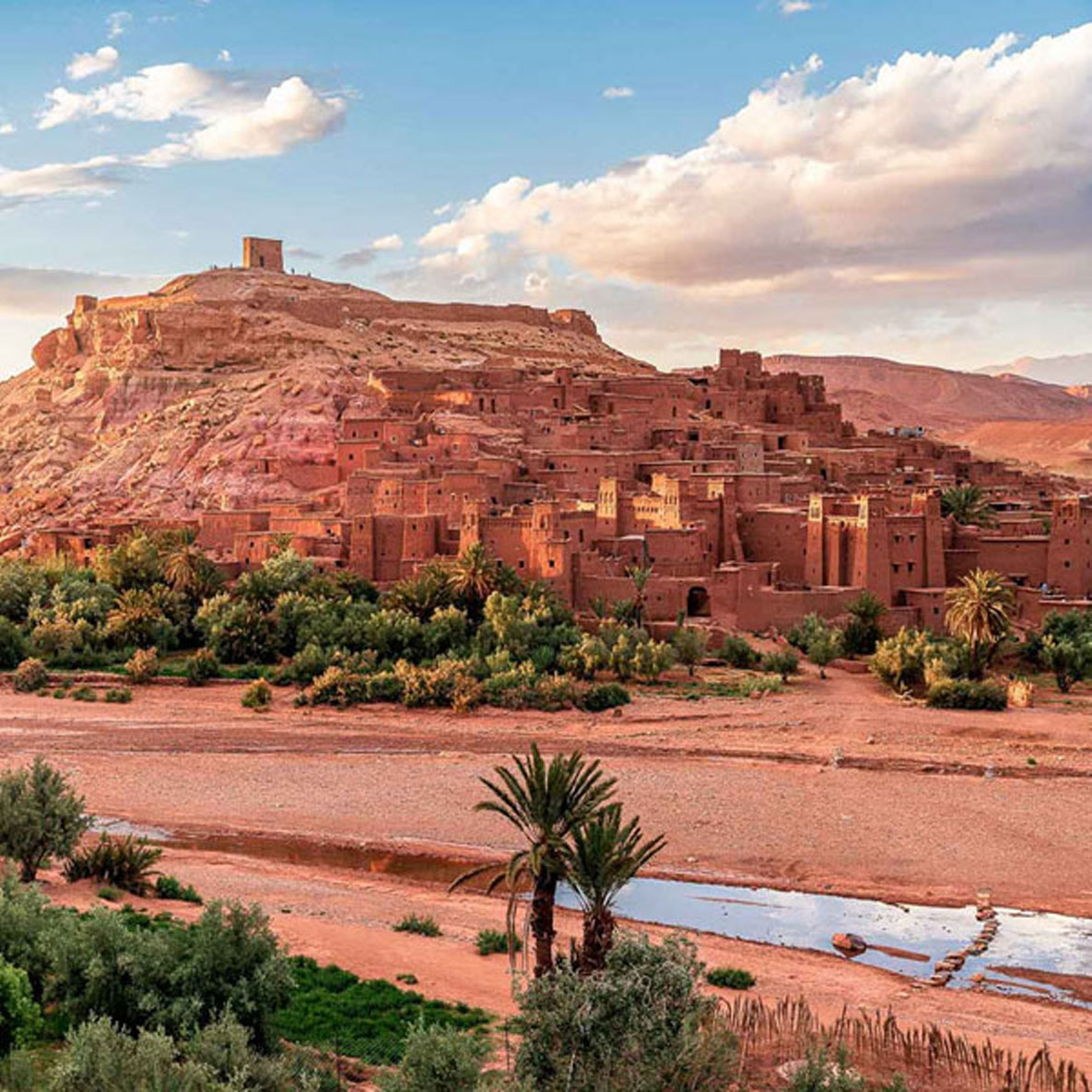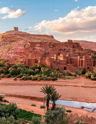 Conduce por la “Ruta de las Mil Kasbahs”, salpicada de aldeas y oasis. Parada en Ouarzazate, capital del cine en Marruecos, y continúa hacia Aït Ben Haddou, un ksar declarado Patrimonio de la Humanidad con callejuelas y torres históricas. Cruza el Alto Atlas por el paso Tizi n’Tichka, llegando a Marrakech por la tarde.