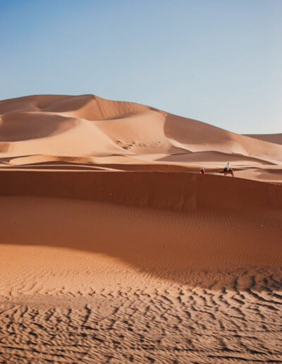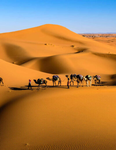 Cruza los dramáticos paisajes del Medio y Alto Atlas hasta Merzouga. Pasa por el exuberante Valle del Ziz antes de llegar al borde del Sahara. Tras un descanso y té, inicia un paseo en camello por las dunas de Erg Chebbi, llegando a tu campamento en el desierto para disfrutar del atardecer. Cena, música junto a la hoguera y una noche mágica bajo el cielo estrellado del desierto.